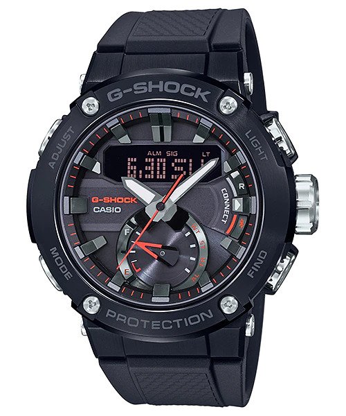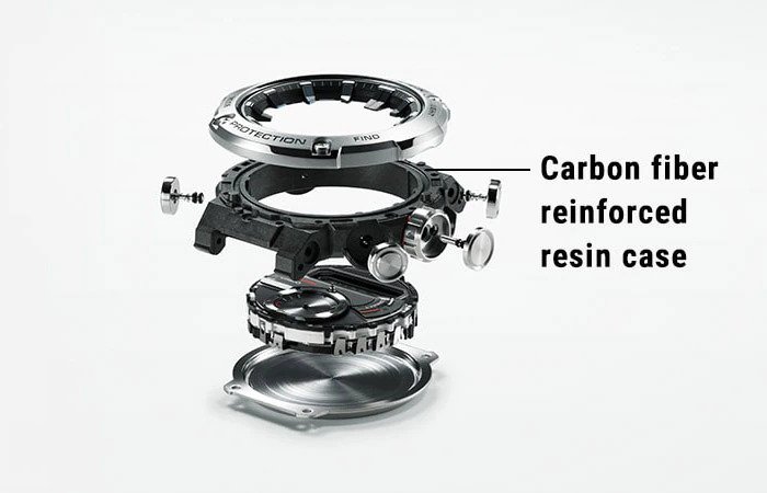 The case is made of fine resin that incorporates carbon fiber for light weight along with rigidity that is superior to that of resin. This material protects the internal module from shock-induced damage and deformation. The dual back cover protects the back surface against impact. The small case of the GST-B100 series base model provides a comfortable fit, even though the watch is equipped with a wide face.
